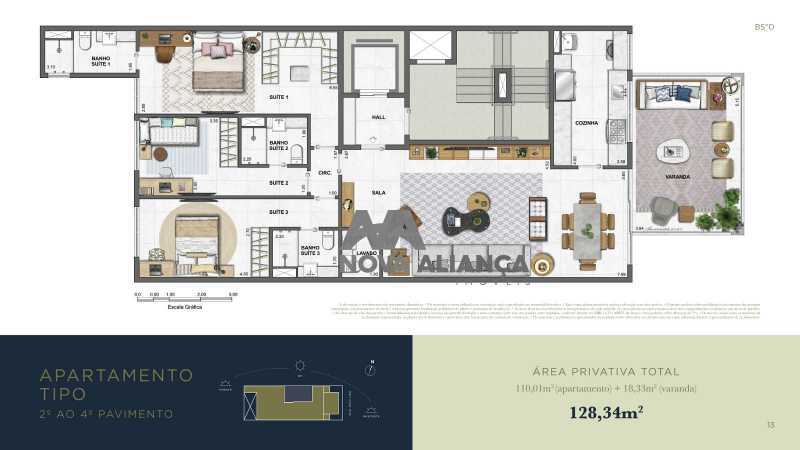 Os apartamentos são compostos por 3 suítes, varanda, ampla sala de estar. A diferença de planta entre os apartamentos do 2º ao 4º pavimento é apenas o terraço descoberto. Os apartamentos possuem 1 vaga na garagem, e todos com metragem de 128,34 m². As plantas confortáveis e espaçosas, irão surpreender você e sua família neste lançamento residencial mais aguardado na região do Leblon no Rio. O projeto arquitetônico já encanta os futuros moradores pela ótima disposição de cômodos e oportunidades para ter o maior conforto em seu lar.